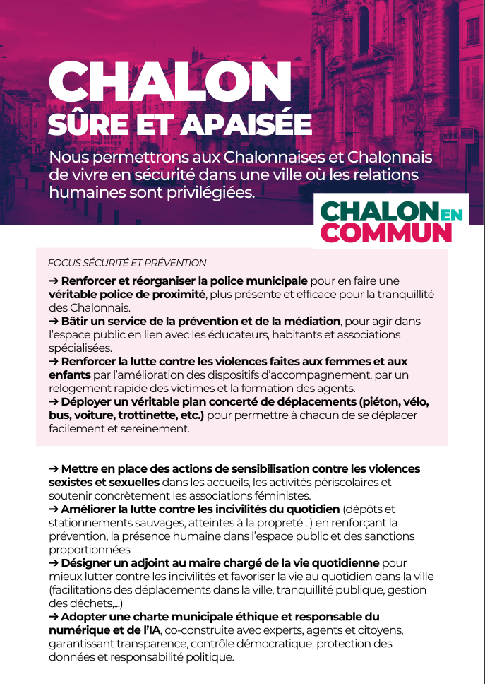 Chalon dispose d’atouts considérables. Pourtant, notre ville peine aujourd’hui à retenir ses habitants, à maintenir ses services publics et à offrir à chacun des conditions de vie dignes et apaisées. Des commerces ferment, des familles s’en vont, certains quartiers s’essoufflent. Trop de Chalonnais ont le sentiment que la ville ne répond plus à leurs besoins du quotidien. Ce constat ne doit pas nous décourager. Il doit nous rassembler...
