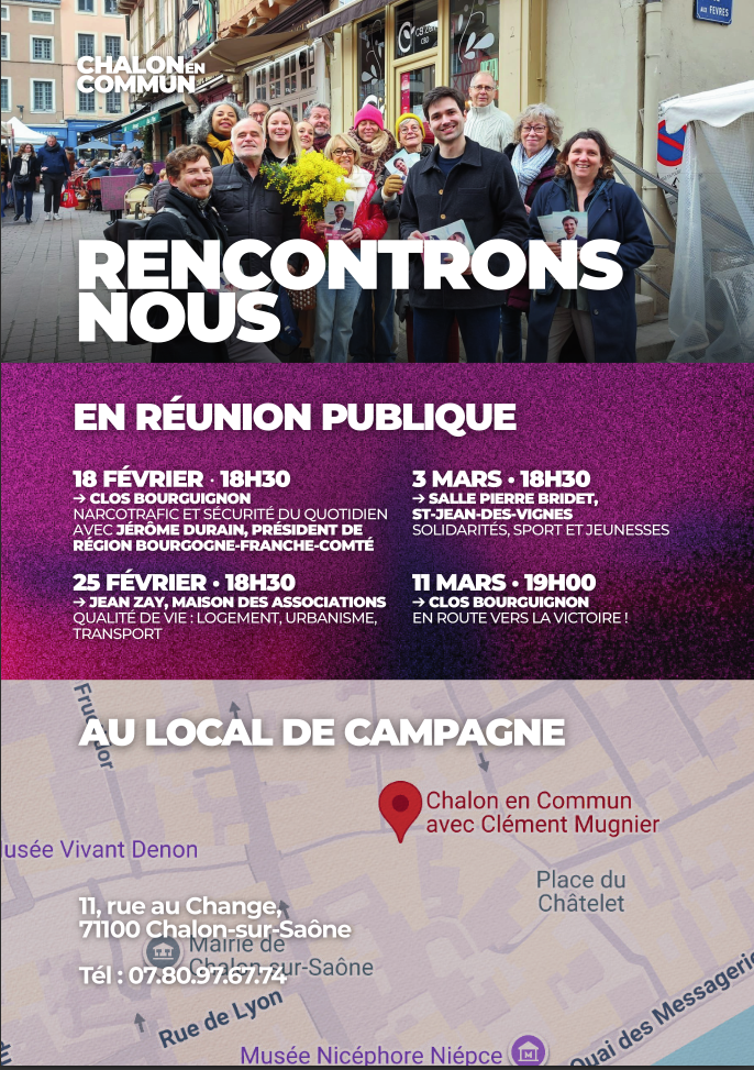 En mars prochain, les Chalonnaises et les Chalonnais feront un choix décisif pour l’avenir de notre ville. Ce choix engage bien plus qu’un mandat. Il engage la capacité de Chalon à protéger ses habitants, à se renouveler et à préparer l’avenir dans un monde traversé par de profondes transformations sociales, écologiques et économiques.