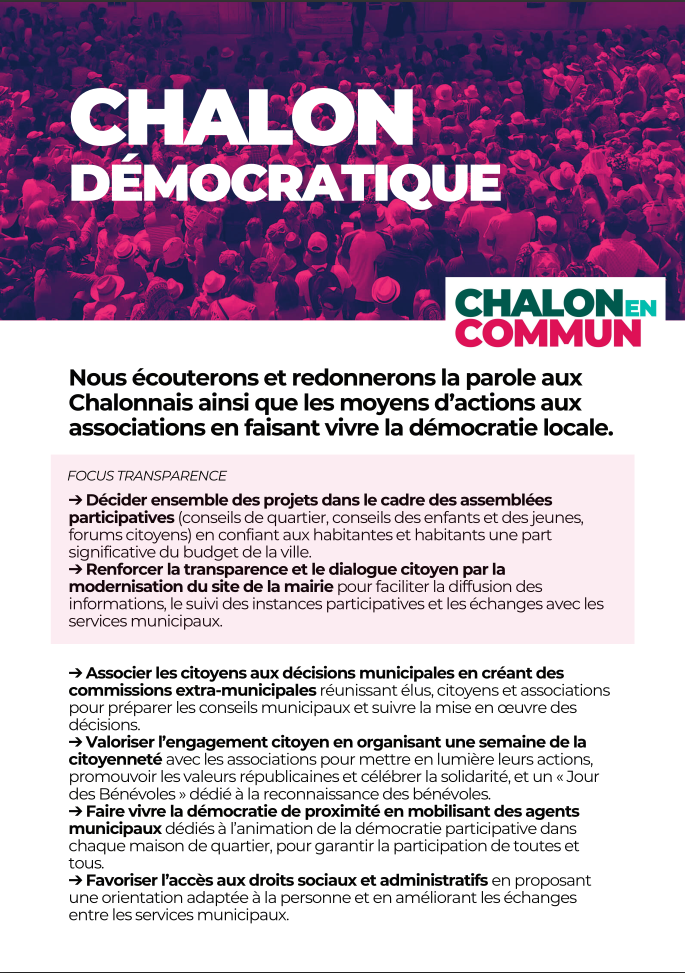 Après des mois de travail des commissions citoyennes, puis l'accord des organisations soutenant Chalon En Commun, voici le programme de notre liste de rassemblement à gauche, pour une nouvelle politique de gauche à Chalon.
